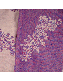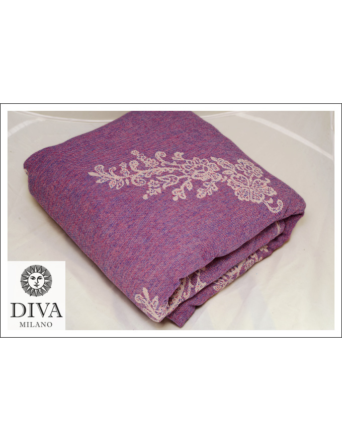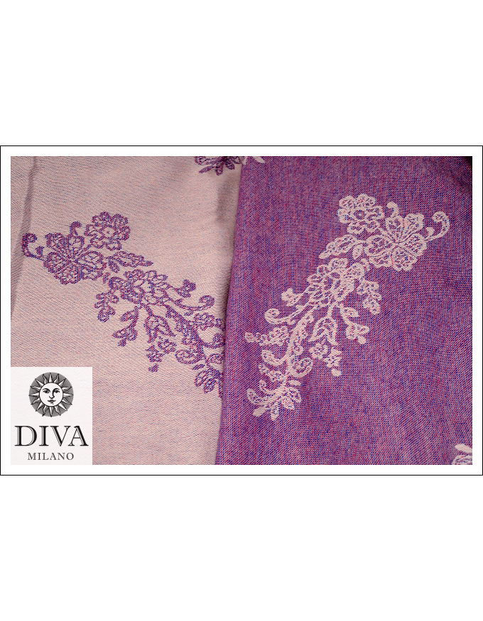 Diva Milano Reticella Viola is one of the models of the Lace Collection (autumn/winter 2011/12), produced as a woven wrap and a ring sling, made from 58% cotton and 42% wool. It is warm and cosy, great for long winter days. It is tricolor, with natur warp and 2 weft threads: azzurro and rosa, produced in a very limited quantity.